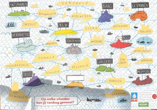 Een ander hulpmiddel dat je kunt gebruiken om kinderen te helpen gevoelens en emoties onder woorden te brengen is de emotiekaart. Op de afbeelding zie je verschillende gevoelens en emoties weergegeven als eilanden. Je kunt bijvoorbeeld vragen: ‘Op welk eiland ben je vandaag geweest?’